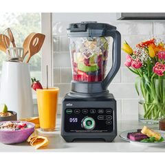 The all-new Braun TriForce Power Blender is a powerhouse kitchen performer with superior speed and selection for an effortless personalized blending experience beyond compare. The first-ever power blender to feature a TriAction technology jug, designed with a triangular shape with the long lasting, durable Tritan™ material. This sophisticated engineering guarantees 60% finer and 4x faster blending*. The seamless intuitive interface makes it easy to quickly master recipes thanks to the iTextureControl functionality. Simply select any one of the 6 automated programs to start, then choose between one of 3 unique texture settings – smooth, medium or coarse - for 18 possible blends as precise as your palate. It also has a smooth hot soup setting that simultaneously heats as it spins, resulting in the perfect soup texture and warm temperature, every time. It’s just one of many versatile features this Braun power blender brings to the kitchen. The blender’s innovative technology is supported by 1600 watts of continuous power and premium stainless steel blades forged in Solingen, Germany. The sharp PrecisionEdge Blades effortlessly emulsify the toughest ingredients like hearty root vegetables and dense chunks of ice, ensuring everything from silky smoothies to savory spreads are equally enjoyable; while the durable motor system also offers 10 manual speed settings, plus a multi-speed pulse function to bring every foodie craving to fruition. And just like every dish needs a finishing touch, this blender delivers with a built-in clean button that’s both user-friendly and functional. Even the durable touch screen is a wipe clean surface. With the included 5 year warranty, it’s easy to see why the innovative Braun TriForce Power Blender is the accomplished culinary sidekick your kitchen’s been searching for. *Compared to the Braun JB7201